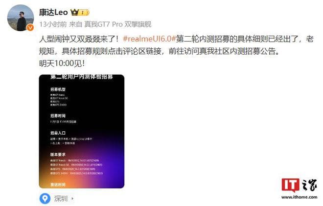 IT之家 11 月 5 日消息,realme UI 6.0 第二轮用户内测体验招募将于今日 10:00 启动,适配真我 GT Neo6、真我 GT5、真我 GT Neo6 SE、真我 GT5 240W 四款机型,真我 realme UI 产品经理 @康达Leo 昨日发文公布此次内测招募细则。