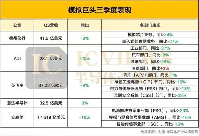 看今年三季度财报,国际模拟巨头全部飘绿,同比均有下滑。