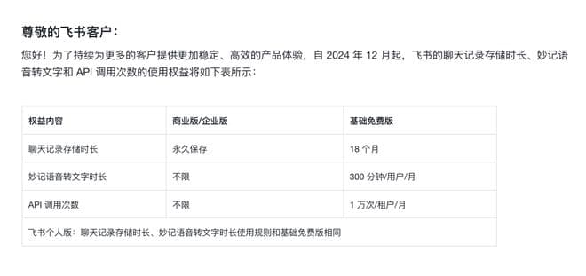 今年,飞书进一步调整了存储空间的使用规则,并在近期宣布限制语音转文字的时长:自2024年12月3日起,飞书免费版用户每月仅有300分钟的"妙记语音转文字"免费额度,而之前这一功能没有时长限制。