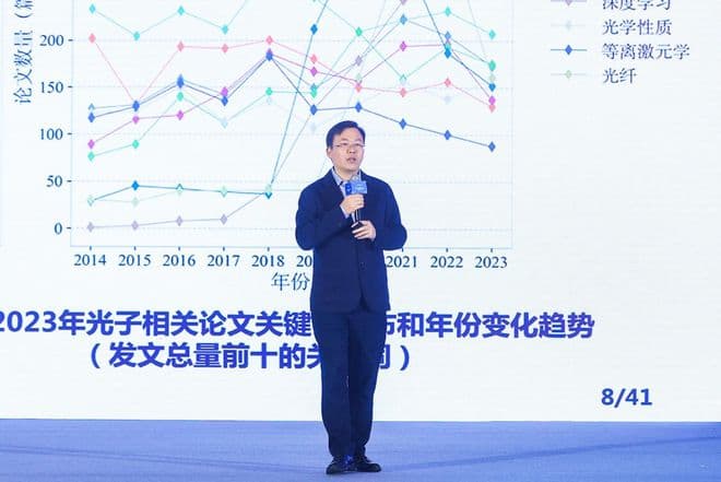 东壁科技数据创始人、深圳大学特聘教授吴登生向来自光子领域科研及产业界300多位与会嘉宾介绍《蓝皮书》核心内容。他表示,《蓝皮书》撰写团队根据东壁自有数据进行期刊学术影响力计算,结合领域专家意见,综合遴选光子技术领域83种重要期刊,从中采集25.6万篇科研论文,进行深度分析,研判该领域的研究前沿和发展趋势,“通过报告分析,以期为光子技术的研究和应用提供全面的视角,为相关领域的决策者和实践者提供有价值的参考。”