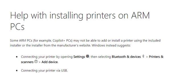 微软在最新的支持文档中表示,某些基于Arm的PC可能无法使用随附的安装程序或制造商网站上的安装程序添加或连接打印机。