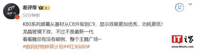 博主@差评帝 今日发文爆料,小米 Redmi K80 系列手机屏幕基材从 C8 升级到 C9(此处预计指 TCL 华星 C 系发光材料),显示效果提升、功耗降低。新机还将配备龙晶玻璃(非最新一代)。
