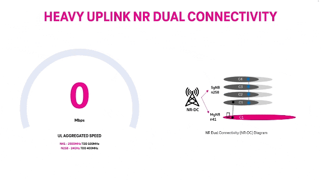 为了完成这一纪录,T-Mobile 部署了一项名为新无线电双连接(5G DC)的功能,旨在增加吞吐量和容量,从而实现前所未有的上传速度。简单来说,5G DC 技术能够使 T-Mobile 通过聚合 2.5 GHz 中频频段和高频毫米波频谱实现更快的速度。