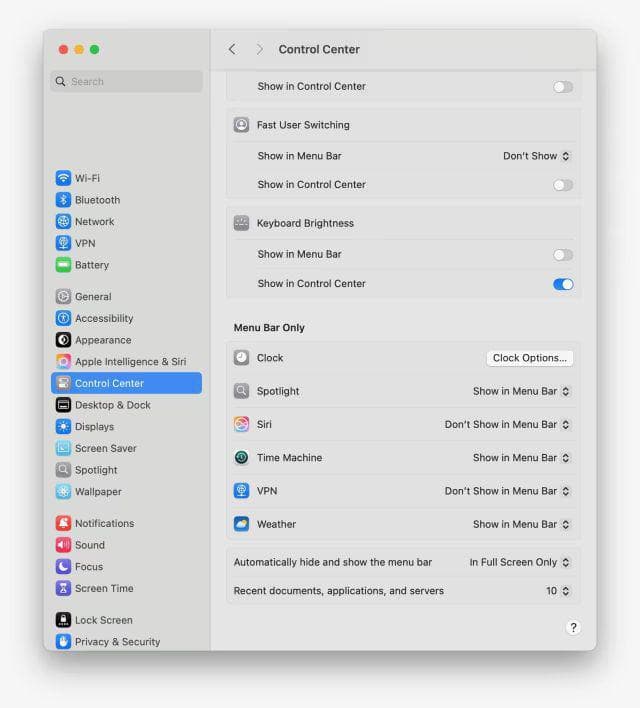 用户可以访问控制中心,在系统设置中启用这个新小部件。用户向下滚动找到“仅菜单栏”部分,将天气设置为“在菜单栏中显示”。