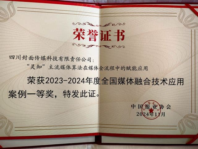 会上,中国报业协会公布了2023—2024年度全国媒体融合技术应用案例等奖项。四川封面传媒科技有限责任公司(以下简称“封面科技”)获得“2024年中国报业技术创新企业”,案例《“灵知”主流媒体算法在媒体全流程中的赋能应用》荣获“2023—2024年度全国媒体融合技术应用案例一等奖”,《支撑省域一网三通的智媒传播平台》荣获“2023—2024年度全国媒体融合技术应用案例二等奖”,《 “一点通”全媒体多终端内容智能管理中枢》荣获“2023—2024年度全国媒体融合技术应用案例优秀奖”。