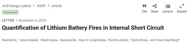 S. Ge, T. Sasaki, N. Gupta, K. Qin, R.S. Longchamps, K. Aotani, Y. Aihara, C.Y. Wang, Quantification of Lithium Battery Fires in Internal Short Circuit, ACS Energy Lett. 2024, 9, 5747–5755.
