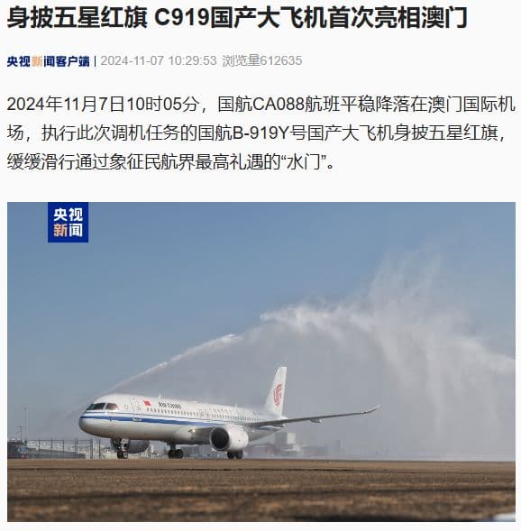 IT之家 11 月 7 日消息,据央视新闻报道,10 时 05 分,国航 CA088 航班平稳降落在澳门国际机场,执行此次调机任务的国航 B-919Y 号国产大飞机身披五星红旗,缓缓滑行通过象征民航界最高礼遇的“水门”。