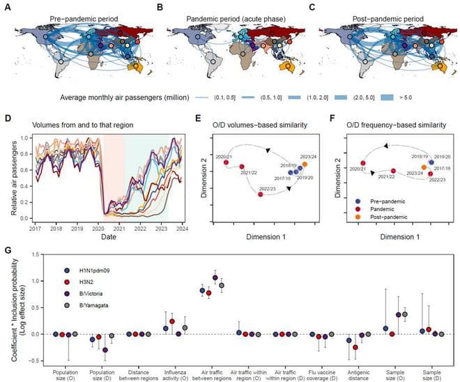 研究结果发现,季节性流感的活动水平和区域间航空流量均经历了“下降后恢复”的过程。区域间航空流量往往代表着长距离的人群移动情况。在时间异质性的系统动力学模型框架下进一步结合基因序列数据,团队发现,区域间航空流量是4个时期全球季节性流感传播的主要驱动因素。通过估计地理进化树中的主干区域,发现大流行期间,南亚和西亚分别是维持A型流感和B/Victoria循环的关键区域。