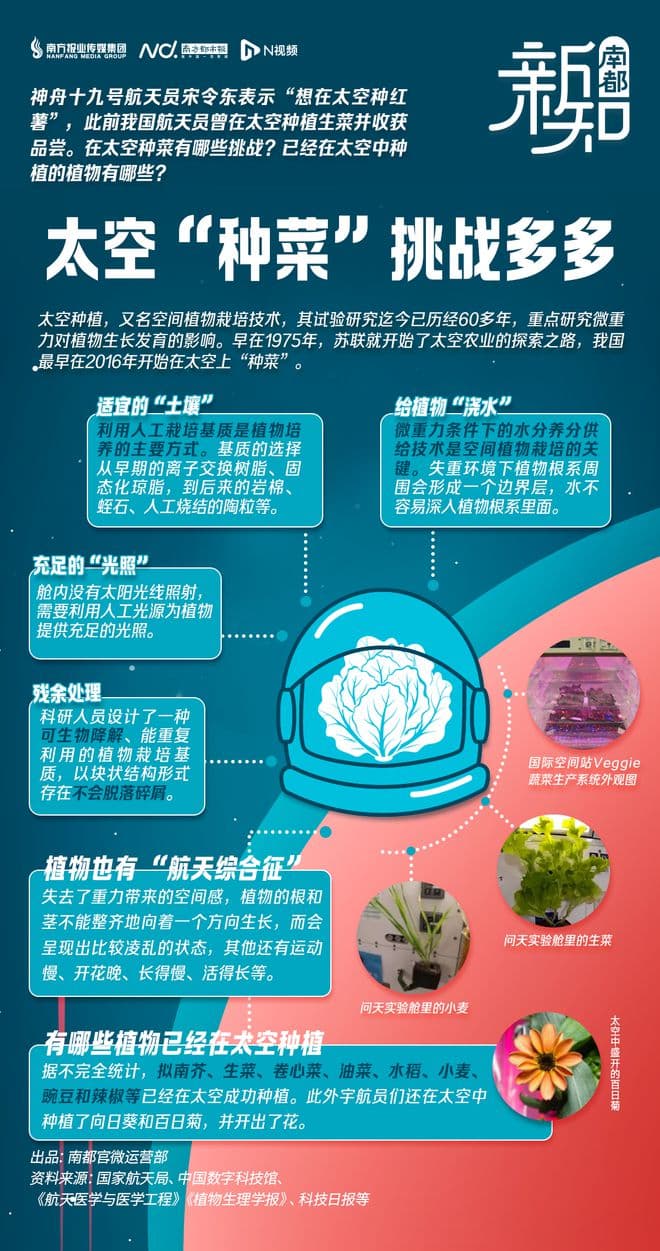 神舟十八号、十九号乘组在空间站会师,航天员李广苏表示“特地新种了一批生菜,等着大家伙儿一起品尝”,神舟十九号航天员宋令东表示“想在太空种红薯”,在太空种菜有哪些挑战?已经在太空中种植的植物有哪些?