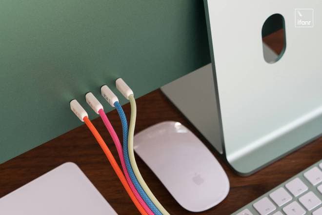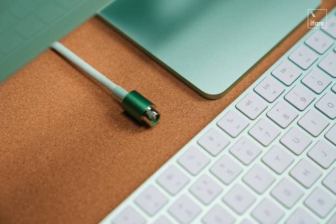 值得一提的是,这一代的电源线也拥有了与 iMac 本体匹配的清淡颜色,而不是标配白色了。