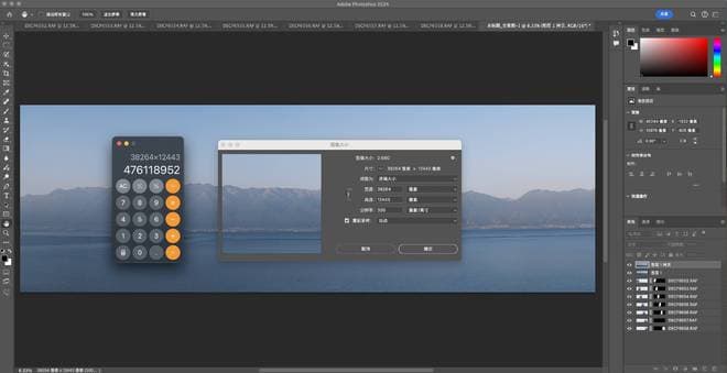 这七张照片每张 1 亿像素,接片后去掉重叠部分,再进行矫正,像素量达到了 4.7 亿,工程文件大小为 10.7GB。