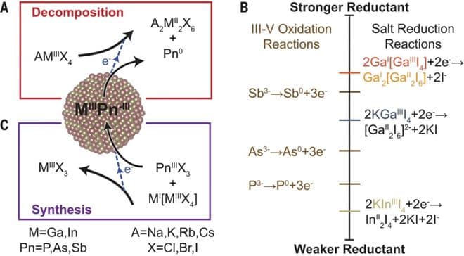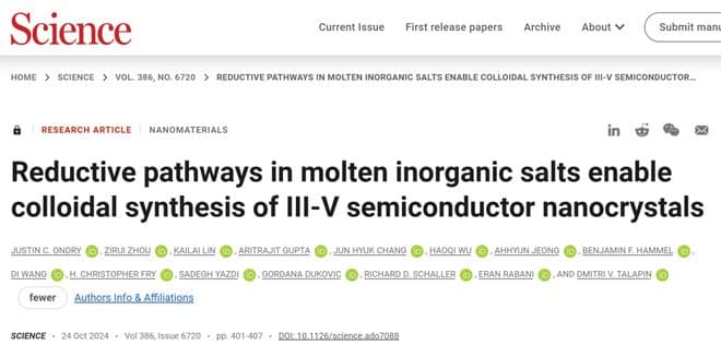 日前,相关论文以《熔融无机盐中的还原途径可实现 III-V 半导体纳米晶体的胶体合成》(Reductive pathways in molten inorganic salts enable colloidal synthesis of III-V semiconductor nanocrystals)为题发在 Science[1]。