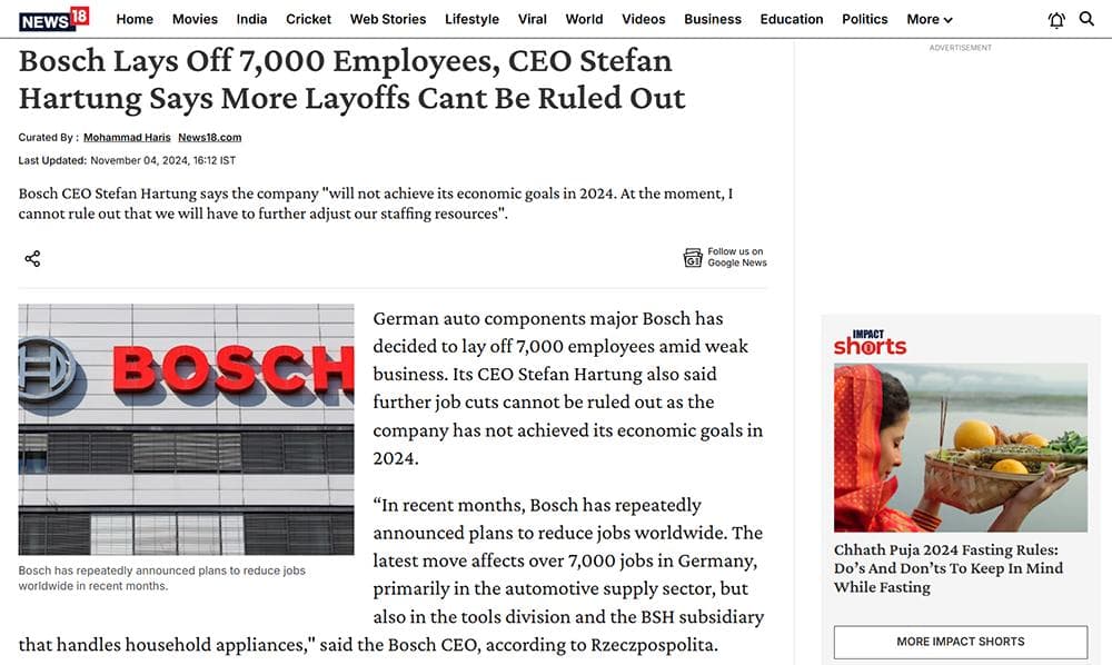 据了解,最新的裁员行动影响了德国7000多个工作岗位,主要涉及汽车供应部门,同时也波及到工具部门和负责家用电器的BSH子公司。在不到一年的时间内,这已经是博世的第四波裁员行动。