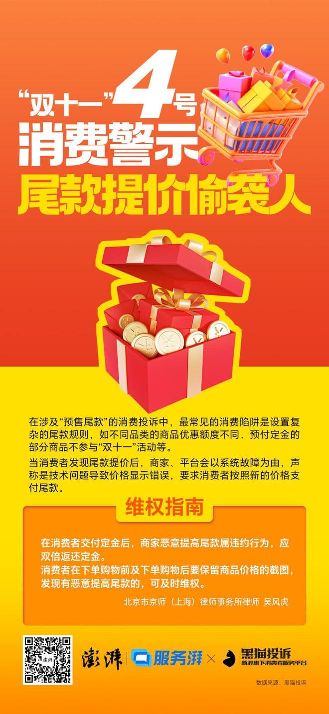 消费购物不迷“路”,今天,澎湃公众互动平台“服务湃”(https://tousu.thepaper.cn)携手新浪旗下消费者服务“黑猫投诉”平台(https://tousu.sina.com.cn),联合推出“双十一”消费警示,本篇聚焦“预售尾款提价”。