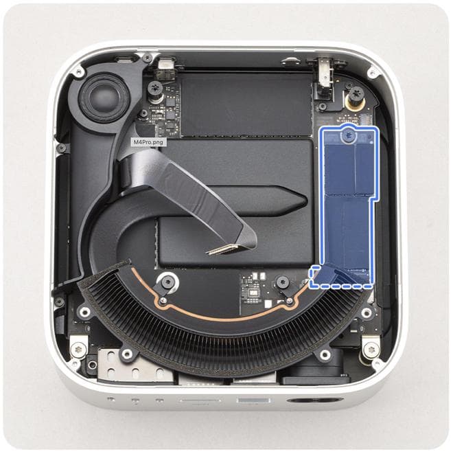 IT之家注意到,新款Mac mini实际上配备了可拆卸式 SSD,但这种 SSD 并非传统意义上的“SSD”而是苹果专门定制的插槽式 NAND 板,而 SSD 最重要的 NVMe 控制器仍位于 M4 芯片中,所以用户无法随意更换,但不排除苹果后续提供存储升级业务的可能。