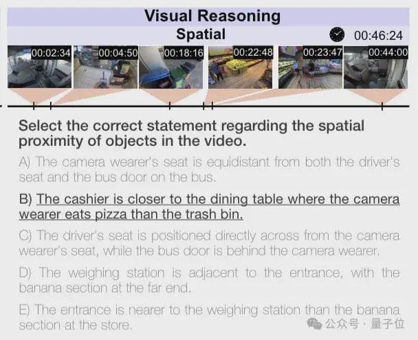 空间推理负责判断物体之间的空间关系、空间接近度(如微波炉与冰箱或水槽相比是否更近)以及空间布局(如选择正确描绘脖子上挂相机的人的公寓的布局图)。