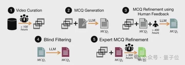 团队用两个独立的大模型——GPT-4-turbo和GPT-4,对MCQ₃进行盲筛,确保剩余 MCQ₄高质量且专门测试长视频语言理解。