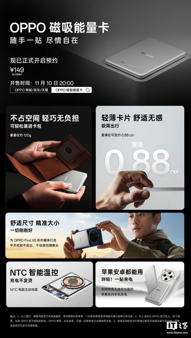 IT之家 11 月 10 日消息,OPPO 磁吸能量卡移动电源将于今晚 8 点开售,价格为 149 元,容量为 5000mAh。