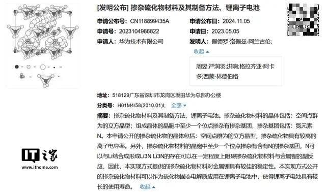 IT之家 11 月 10 日消息,11 月 5 日华为公布了最新的硫化物固态电池专利,名称为《掺杂硫化物材料及其制备方法、锂离子电池》。
