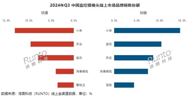 根据洛图科技线上全渠道数据,2024 年第三季度,小米、萤石、乔安、普海康威视在线上市场的销量、销额维度下稳居前四,销量合计份额(CR4)为 36.7%。