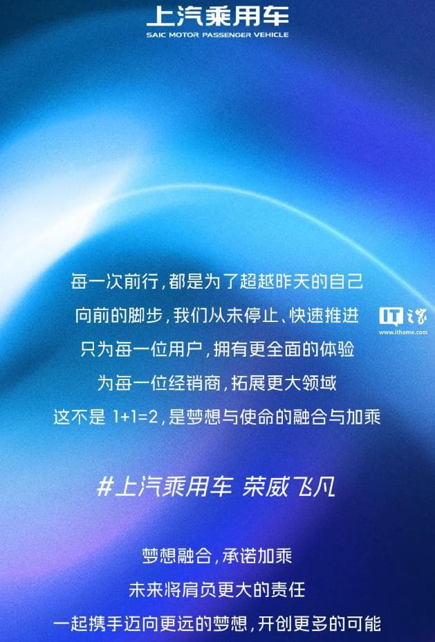 IT之家 11 月 11 日消息,上汽集团于今年 11 月 8 日在上证 e 互动回复投资者提问时表示,近期上汽乘用车已正式宣布《上汽乘用车荣威飞凡,梦想融合,承诺加乘》,荣威与飞凡品牌将加快在研发、销售、服务等层面的融合。