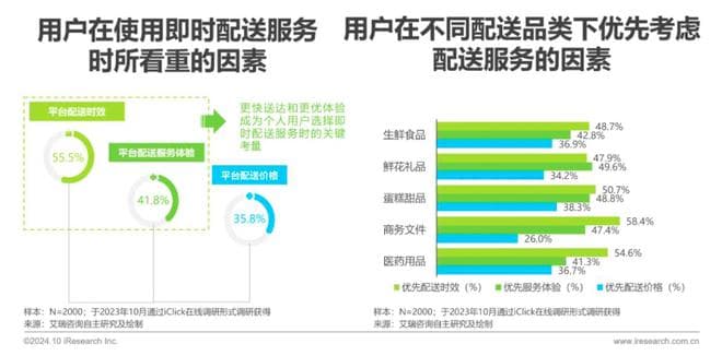 如艾瑞咨询在2023年10月展开的一项用户调研显示,用户主动使用即配服务时看重的前三个因素依次是:平台配送时效、配送服务体验和平台配送价格,三个因素占比分别为55.5%、41.8%和35.8%。