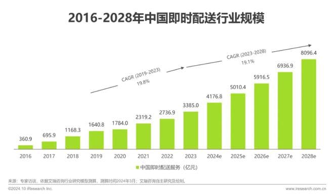 与此同时,中国即时配送市场亦在高速扩容。据艾瑞咨询今年3月测算,中国即时配送行业2019-2023年均复合增速为19.8%,预计在2023-2028年间,年均增速将高达19.1%,至2028年行业整体规模或将增加至8096.4亿元。