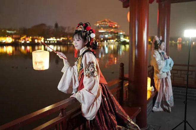 2024年2月2日,游客在西安大唐芙蓉园拍照游玩。新华社记者 邵瑞 摄