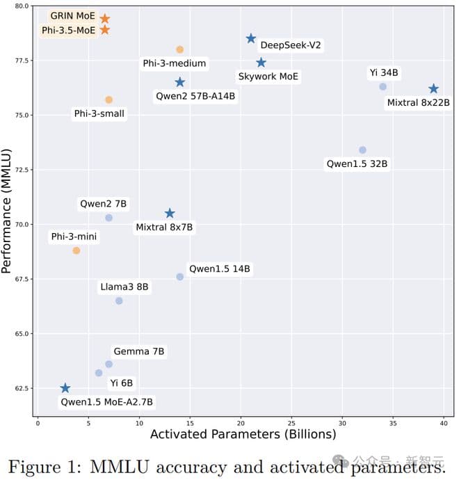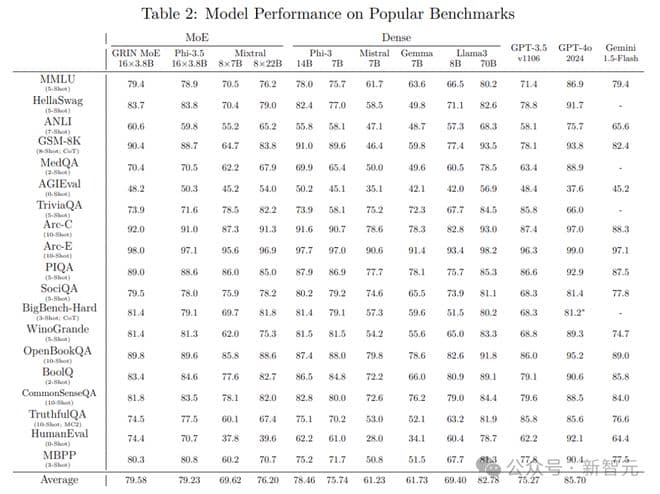 在MMLU(大规模多任务语言理解)基准测试中GRIN得分为79.4,超过了同为MoE架构的Mixtral(70.5分),以及自家的Phi-3.5(78.9分)。