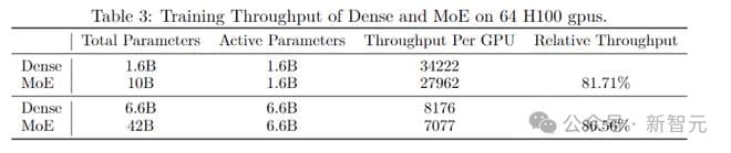 此外,在扩大模型大小时,密集模型和MoE模型显示出相似的减速模式,比如6.6B密集模型的训练吞吐量大约比1.6B密集模型的训练吞吐量慢4.19倍(后者的参数少4倍)。同样,42B MoE模型的训练吞吐量比10B MoE 模型的训练吞吐量慢约3.96倍(对应参数少4.2倍)。