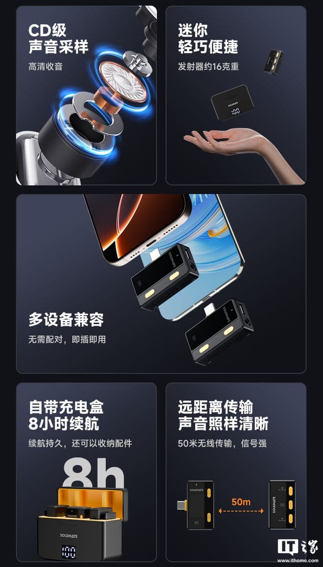 该款麦克风支持 50m 距离不断频、声音不断连传输;其自带充电盒,官方宣称续航 8 小时;麦克风配备无线发射器(重约 16g),号称“支持兼容市面上 99% 的设备”,无需配对、即插即用。