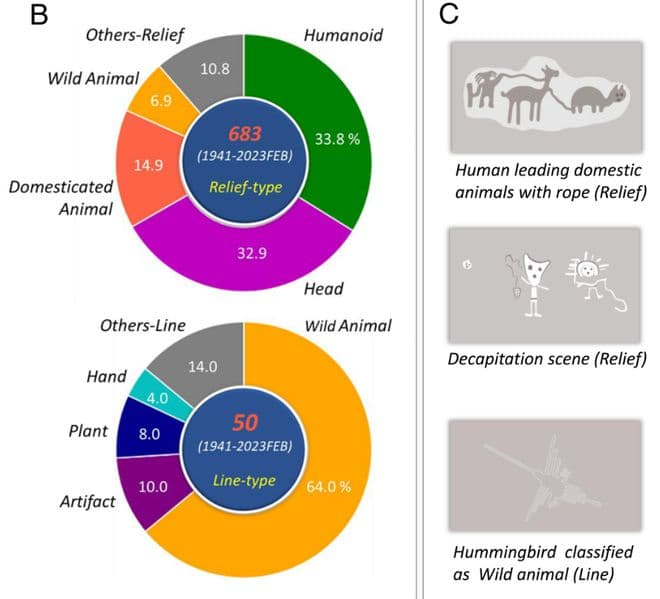 研究结果显示,巨大的线型具象地画(以及几何型地画)多描绘野生动植物,而这类图案在浮雕型地画中较为少见。在浮雕型地画中,常见的是人类形象或经人类改造的事物,如驯养的动物和被砍下的头颅等,而这些图案从未出现在线型地画中。