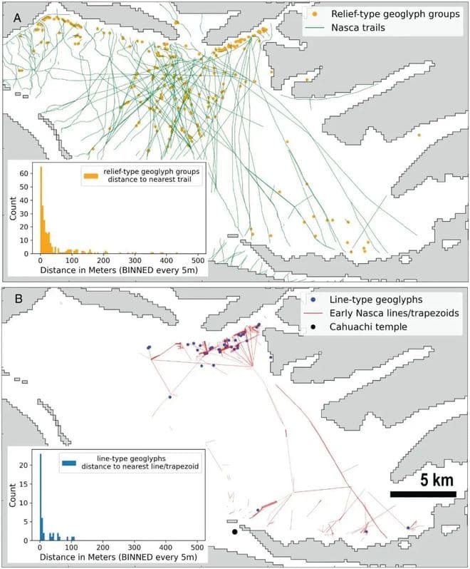 通过研究这些地画的地理分布,研究人员发现,线型地画通常位于由大路构成的道路网络附近(平均相距34米),并集中在纳斯卡河谷的两个主要出入口:一个位于卡瓦奇神庙(Cahuachi Temple,当时主要的祭祀场所)附近,另一个靠近纳斯卡河的发源处。研究人员推测,巨大的线型地画可能是由社区集体建造的,引导人们前往卡瓦奇神庙和纳斯卡河谷的汇流之地进行朝圣。