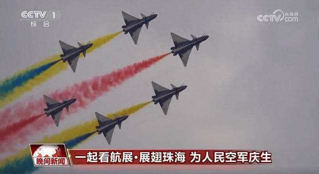 六机斤斗,五机雁队通场加六号机大半径横滚......空军八一飞行表演队3架歼-10C和3架歼-10S表演机特别使用代表空军军旗颜色的红、黄、蓝3色拉烟,通过一系列特技动作为空军庆生。