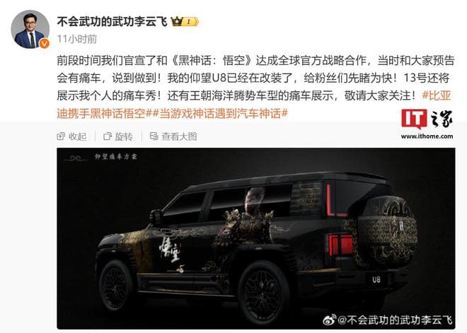 IT之家 11 月 12 日消息,比亚迪集团品牌及公关处总经理李云飞昨日晚分享了比亚迪 ×《黑神话:悟空》仰望 U8“痛车”造型,该车采用联名定制外观设计,车身印有游戏的经典图案画面。