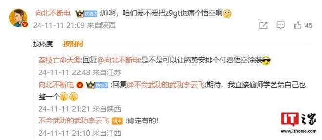 据李云飞介绍,13 号(此处预计只 11 月 13 日)还将展示他个人的痛车秀,还有王朝、海洋、腾势车型的痛车展示。评论区中有网友询问 Z9 GT 车型是否会进行“痛车”改装,李云飞回复“肯定有的”。