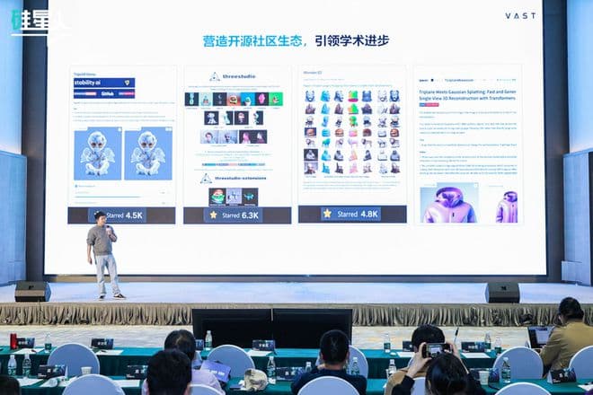 目前我们的3D模型生成技术发展到什么阶段呢?我们可以将其与图像大模型 Midjourney 的水平作比较:在今年年初,我们的技术相当于 Midjourney V3 的水平;到现在我们已经达到了V4的水平,预计明年年初可以达到V5甚至V6的水平。可以把它形象地比喻为:在今年年初时,我们的生成效果类似于手机摄像头的360P 分辨率,而现在的 Tripo 2.0 已经达到了 720P 的清晰度,明年我们有望实现 1080P 甚至 4K 的效果。这一进展基于去年发布的研究论文,表明我们在3D生成领域的核心技术模块已走在前列。作为中国公司,我们在3D生成的技术创新方面奠定了非常核心的技术模块和能力,包括六头六纵的CVPR等等。此外,我们还开源了许多有影响力的项目,包括全球最大的3D算法框架ThreeStudio,图生3D的鼻祖 Wonder3D ,以及全球最大的开源3D仿真生成模型。