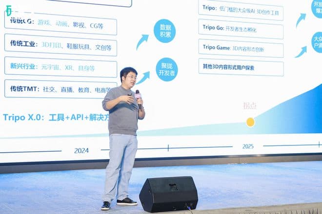我们的目标是在今年使静态的3D模型生成达到实用水平。当前生成的内容已经接近于拥有一年建模经验的建模师的水平,同时,我们正在推进双足及四足骨骼自动绑定、文字生成动作、视频生成动作等功能。预计明年,无论是我的外婆、我的孩子,还是在座的每一位,都可以零门槛、零成本地实时创造完整的3D内容和体验。