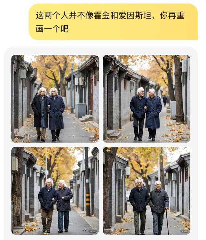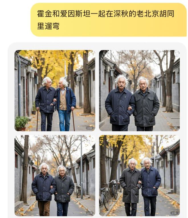 昨天,李彦宏还通过提示词, 让爱因斯坦游遍全世界,比如悉尼歌剧院、复活节岛巨石阵、长城、鸟巢等等,形象逼真。但今天记者在让AI画图霍金和爱因斯坦一起在深秋的老北京胡同里遛弯,放大图来看,除了爱因斯坦发型相似,两个人物都并非特定人物本身,而且长有亚洲面孔。