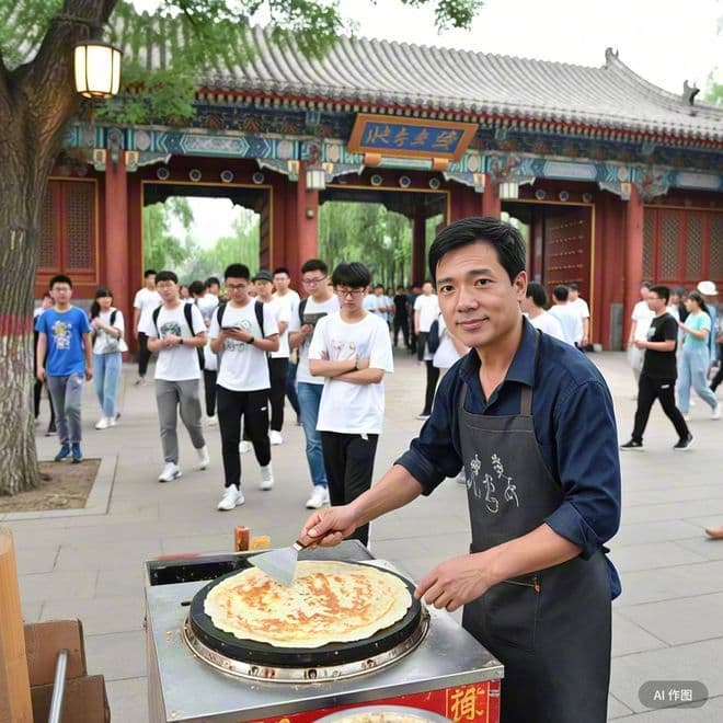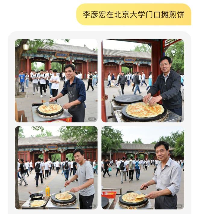 当我们把画图的人物对象变成百度董事长李彦宏,这次AI画得像多了。AI创作了一张“李彦宏在北京大学门口摊煎饼”的图片,人物本身和北京大学的建筑真实度较高,但是放大图后可以看到,建筑上“北京大学”四个字出现了乱码,并非真实的文字。