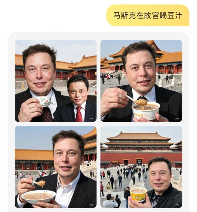 我们让AI画了一张马斯克在故宫喝豆汁的图片,AI画的人物很像马斯克本人,故宫场景也较为逼真,但放大图来看,马斯克喝的并不是豆汁,碗上的文字也是乱码。
