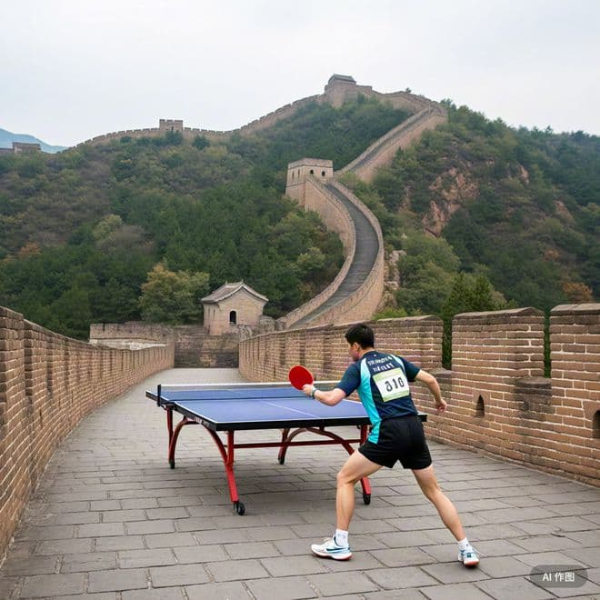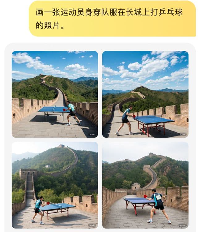 画一张运动员身穿队服在长城上打乒乓球的图片中,无论长城背景还是乒乓球桌,场景的真实还原度很高,但同样,运动员队服的数字呈现是乱码。