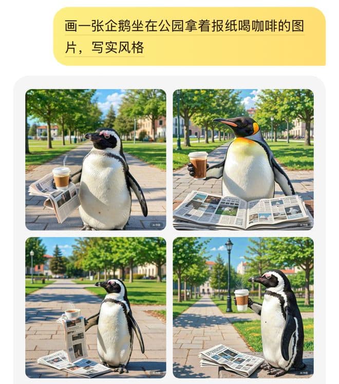 我们让AI作图发现,数字、文字乱码的情况出现频率较高,例如这张猫咪观看时刻表的图片中,有正常的数字,但也有乱码;一张企鹅坐在公园拿着报纸喝咖啡的图片中,手中的报纸文字也出现了乱码。