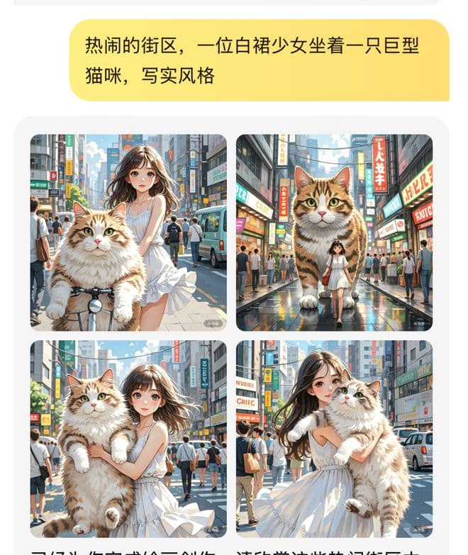 有时,AI还不能够准确理解人类的想法,比如当希望它创作一张写实风格的图片,提示词为热闹的街区,一位白裙少女坐着一只巨型猫咪,AI的绘画结果却都为漫画效果,而且少女并没有坐在猫咪上,有的图片是猫咪骑在自行车上,有的是少女和猫咪前后脚走,还有些是少女怀中抱着猫咪。
