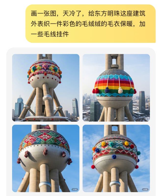 天冷了,让AI给东方明珠织一件彩色毛衣,AI完成度较高。