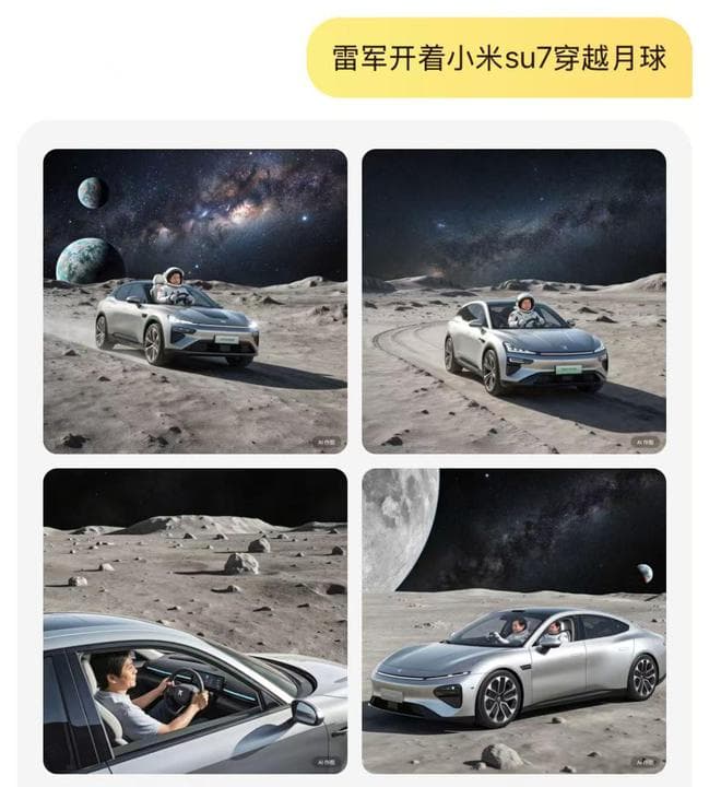 在演讲中,李彦宏提到作为一项基础技术,iRAG在很多领域都有着很好的应用空间。比如,影视作品、漫画作品,连续画本,海报制作等,大幅降低创作成本,“试想一下,如果大众的海报生成的车型长得像丰田,那可就糟心了。”于是,我们让AI生成一张汽车海报,雷军开着小米su7穿越月球,结果显示场景表达较为准确,人物形象相似,但一些图片中汽车和真实的小米su7外形并不相同,小米汽车的LOGO也不够准确。