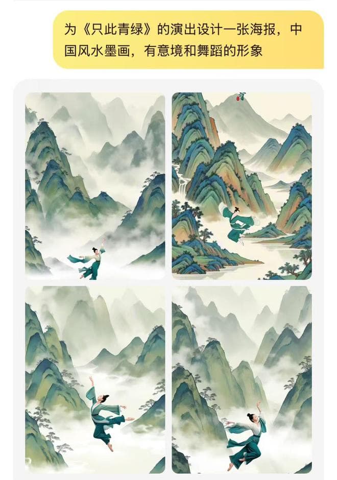 在创作艺术海报方面,记者让AI画一张《只此青绿》演出海报,要求有水墨风格,AI的绘画基本符合要求,有意境,但放大图片看,其中一张海报的文字出现了乱码。