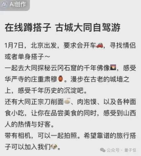 攻略有了,让它帮忙找旅游搭子也同理,直接输入prompt“帮我写一份招募搭子的文案”: