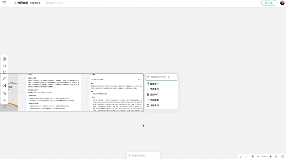 并且得益于百度文库和百度网盘的互通,百度网盘中的私域资料可以与百度文库公域资料融合为自由画布提供创作素材。