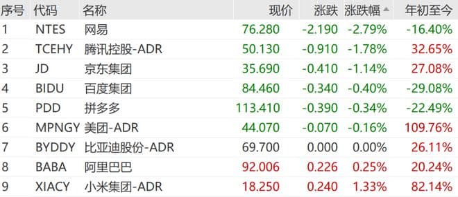中概股多数下跌,纳斯达克中国金龙指数最高跌幅达1.35%,最终收跌1.09%。